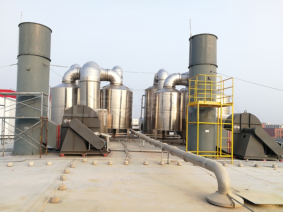 廢氣從廢氣處理塔體下方進(jìn)氣口沿切向進(jìn)入洗滌塔,在通風(fēng)機(jī)的動力作用下,迅速充滿進(jìn)氣段空間,然后均勻地通過均流段上升到第一級填料吸收段。在填料的表面上,氣相中的廢氣或酸堿氣體與液相中堿性(或酸性)物質(zhì)發(fā)生化學(xué)反應(yīng),反應(yīng)生成物質(zhì)(多為可溶性酸(堿)類)隨吸收液流入下部貯液槽。未完全吸收的酸性(或堿性)氣體繼續(xù)上升進(jìn)入第一級噴淋段。在噴淋段中吸收液從均布的噴嘴高速噴出,形成無數(shù)細(xì)小霧滴,與氣體充分混合接觸,繼續(xù)發(fā)生化學(xué)反應(yīng),然后酸性(堿性)氣體上升到二級填料段、噴淋段進(jìn)行與第一級類似的吸收過程。第二級與第一級噴嘴密度不同,噴液壓力不同,吸收酸性(堿性)氣體濃度范圍也有所不同。在噴淋段及填料段兩相接觸的過程也是傳熱與傳質(zhì)的過程。通過控制空塔流速與滯留時間保證這一過程的充分與穩(wěn)定。廢氣處理塔體的最上部是除霧段,氣體中所夾的吸收液霧滴在這里被清除下來,經(jīng)過處理后的潔凈空氣由排氣煙囪排入大氣。