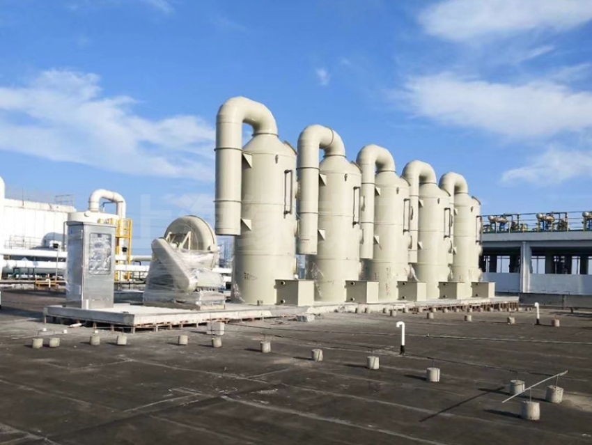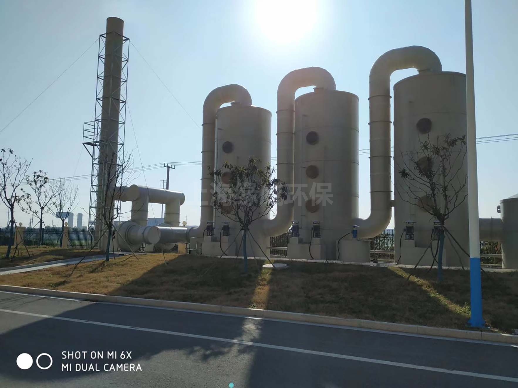 廢氣從廢氣處理塔體下方進氣口沿切向進入洗滌塔,在通風機的動力作用下,迅速充滿進氣段空間,然后均勻地通過均流段上升到第一級填料吸收段。在填料的表面上,氣相中的廢氣或酸堿氣體與液相中堿性(或酸性)物質(zhì)發(fā)生化學反應,反應生成物質(zhì)(多為可溶性酸(堿)類)隨吸收液流入下部貯液槽。未完全吸收的酸性(或堿性)氣體繼續(xù)上升進入第一級噴淋段。在噴淋段中吸收液從均布的噴嘴高速噴出,形成無數(shù)細小霧滴,與氣體充分混合接觸,繼續(xù)發(fā)生化學反應,然后酸性(堿性)氣體上升到二級填料段、噴淋段進行與第一級類似的吸收過程。第二級與第一級噴嘴密度不同,噴液壓力不同,吸收酸性(堿性)氣體濃度范圍也有所不同。在噴淋段及填料段兩相接觸的過程也是傳熱與傳質(zhì)的過程。通過控制空塔流速與滯留時間保證這一過程的充分與穩(wěn)定。廢氣處理塔體的最上部是除霧段,氣體中所夾的吸收液霧滴在這里被清除下來,經(jīng)過處理后的潔凈空氣由排氣煙囪排入大氣。